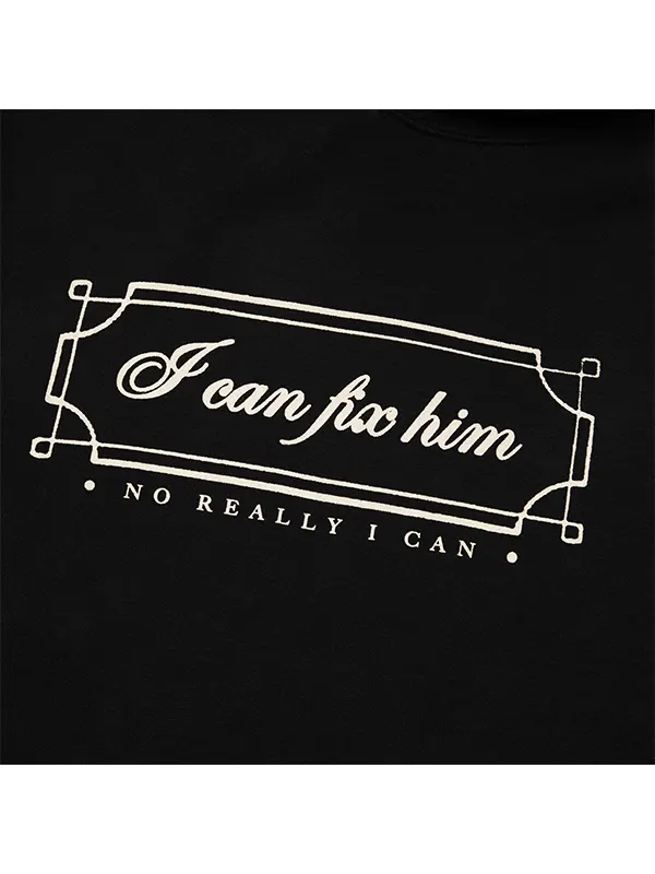 Crafted from soft fleece, it offers a warm and snug feel, making it ideal for cooler days or laid-back evenings. The sleek black color provides a versatile base, while the bold “I Can Fix Him” slogan adds a witty and cheeky vibe that’s sure to turn heads. It’s the kind of piece that sparks conversations and brings a touch of fun to your wardrobe.